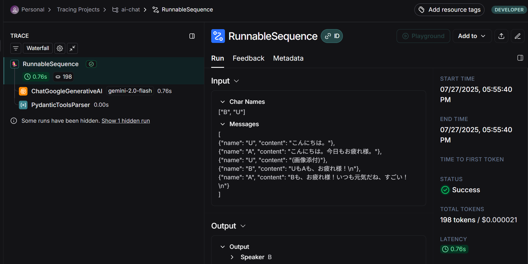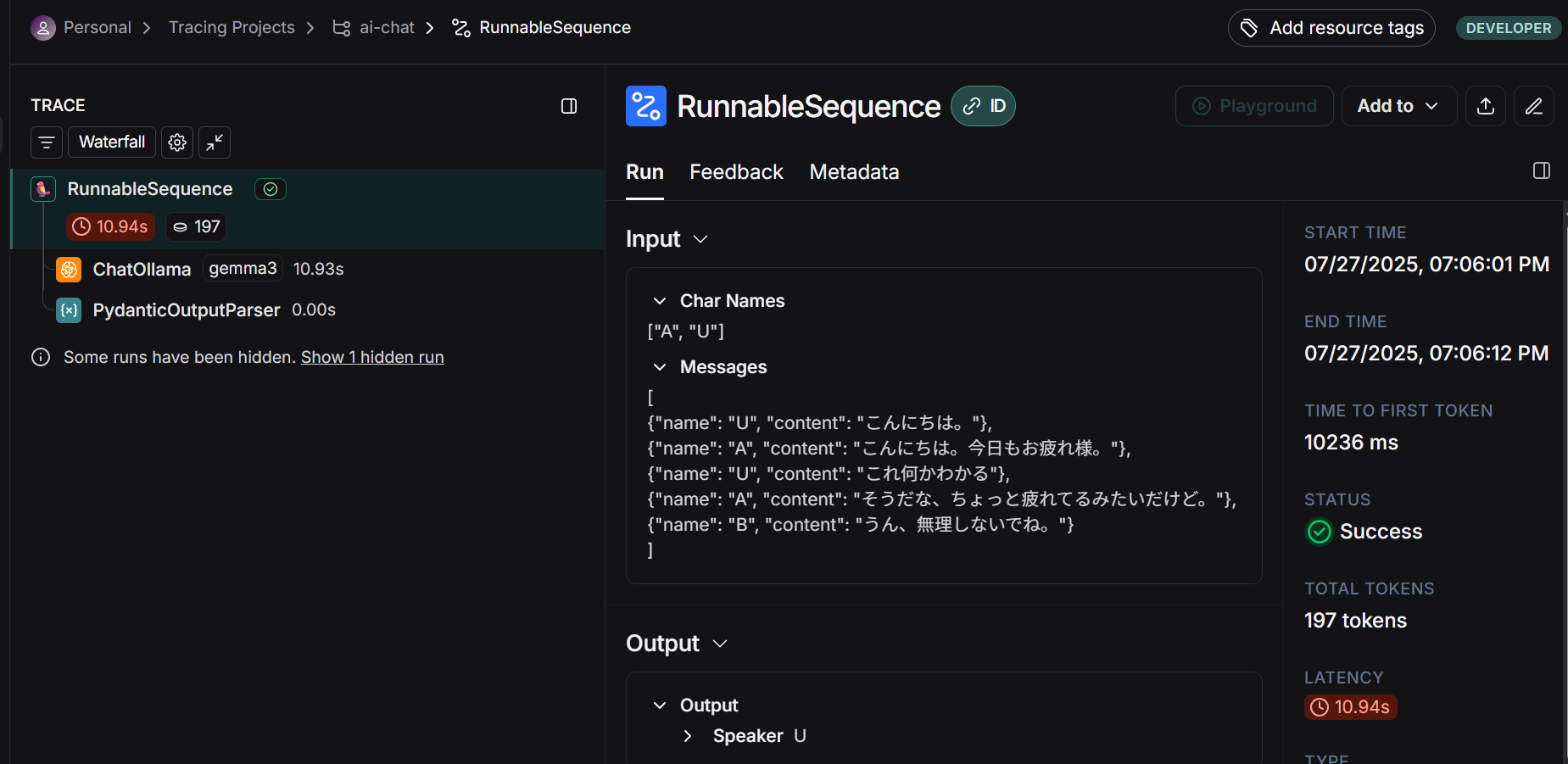--- # 発話生成LLM - 話者決定LLMにより決まった話者の発話内容を生成 - 発話内容は**ストリーミング出力**することで、体感の待ち時間を減らす - `chain.invoke()`の代わりに`chain.stream()`を使う
