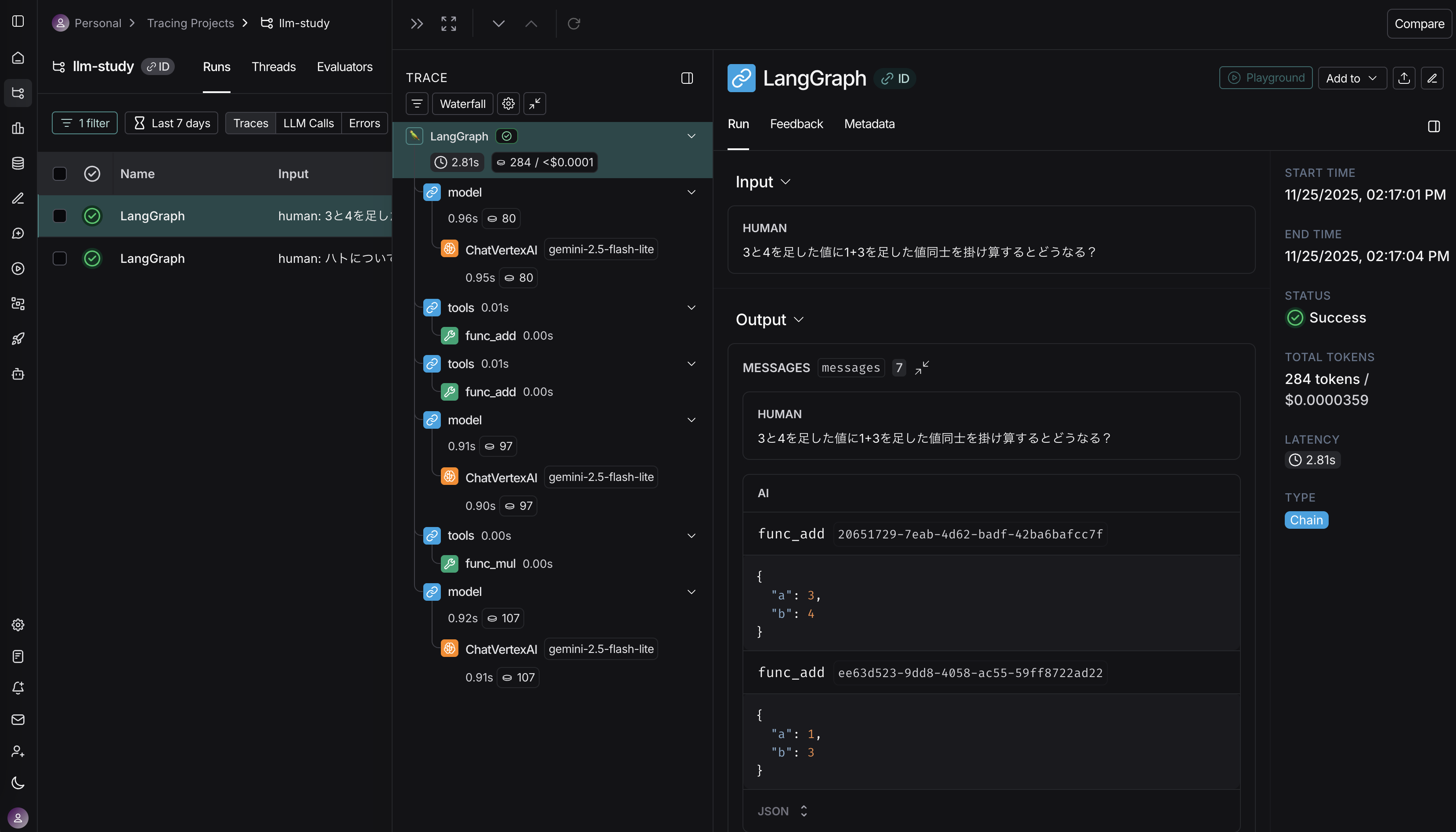 内部でループが回り、 3回LLMが呼ばれている 事がわかる